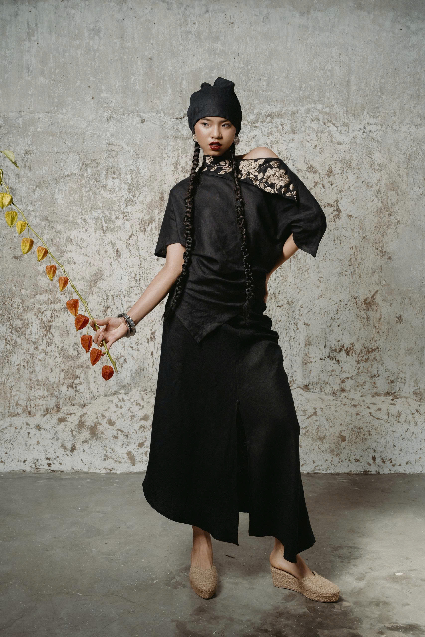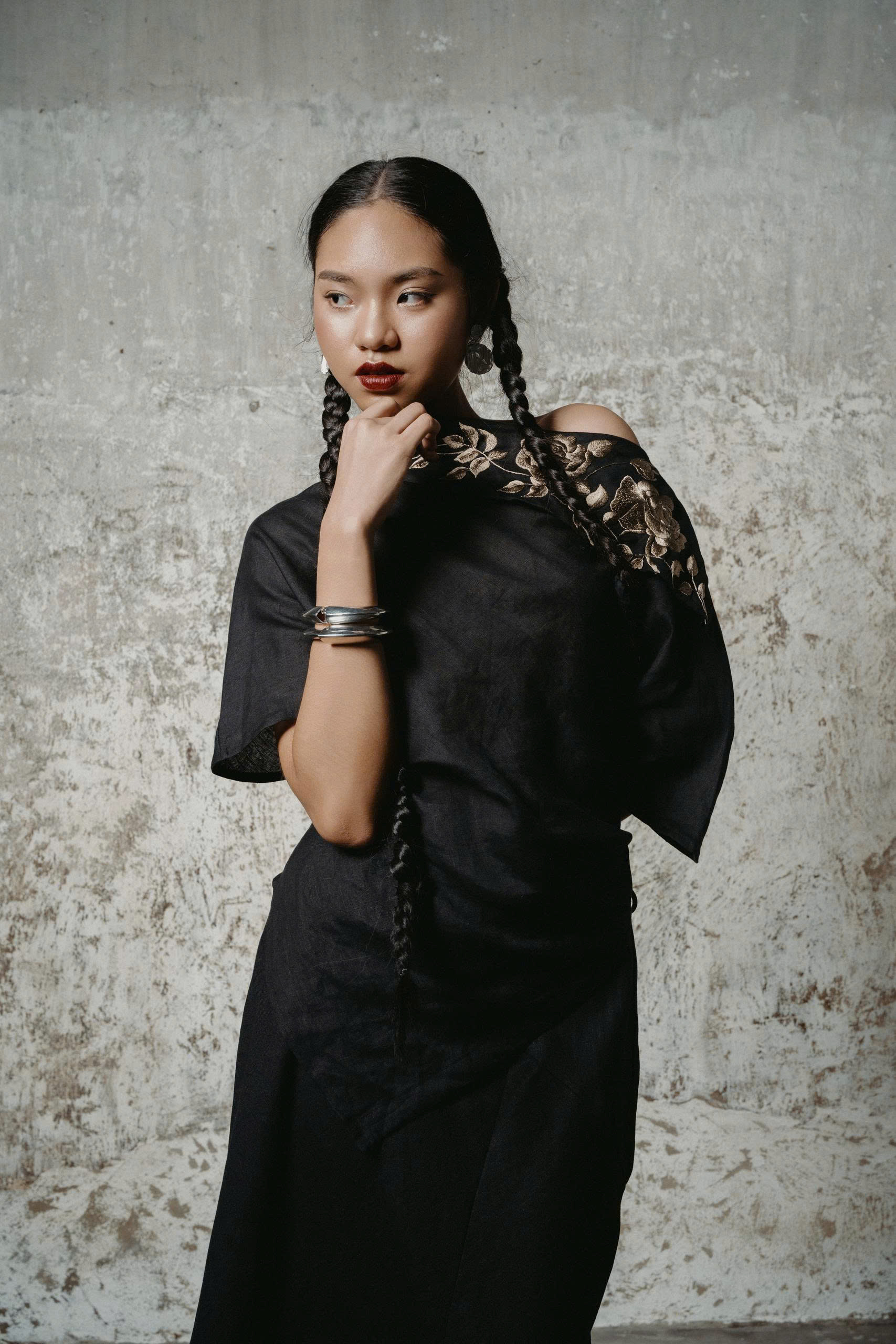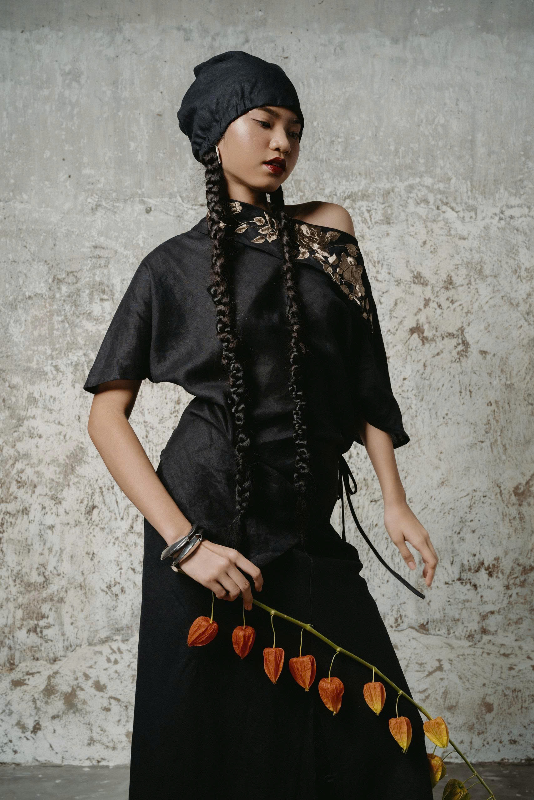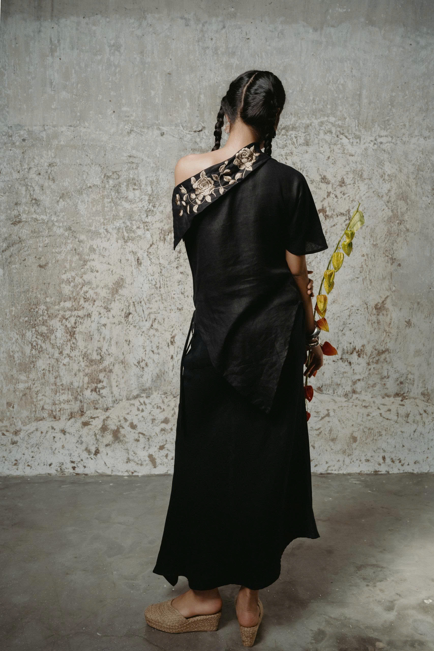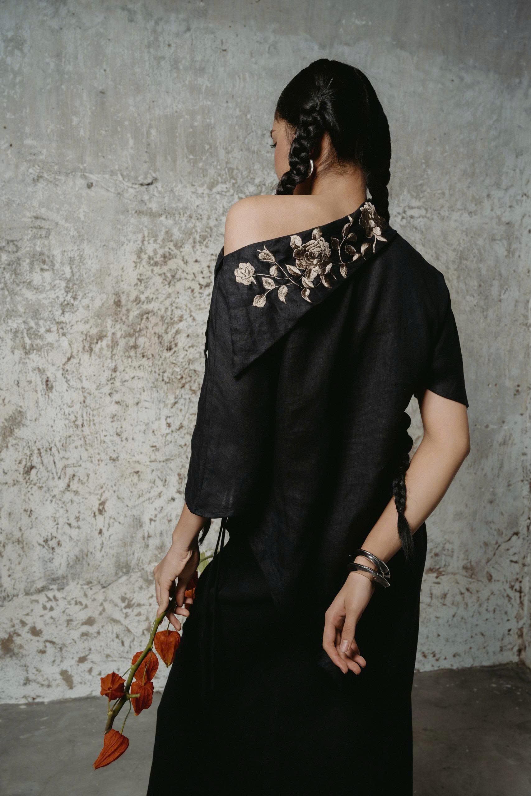 Hoa Ảnh Hồng Đen Shirt điểm xuyết hoa thêu tay trên vai áo. Đường cắt lệch vai tạo điểm nhấn đầy cá tính và hiện đại, mang lại sự chuyển động uyển chuyển như nhịp gió thu.